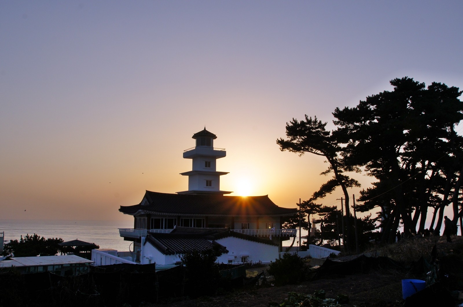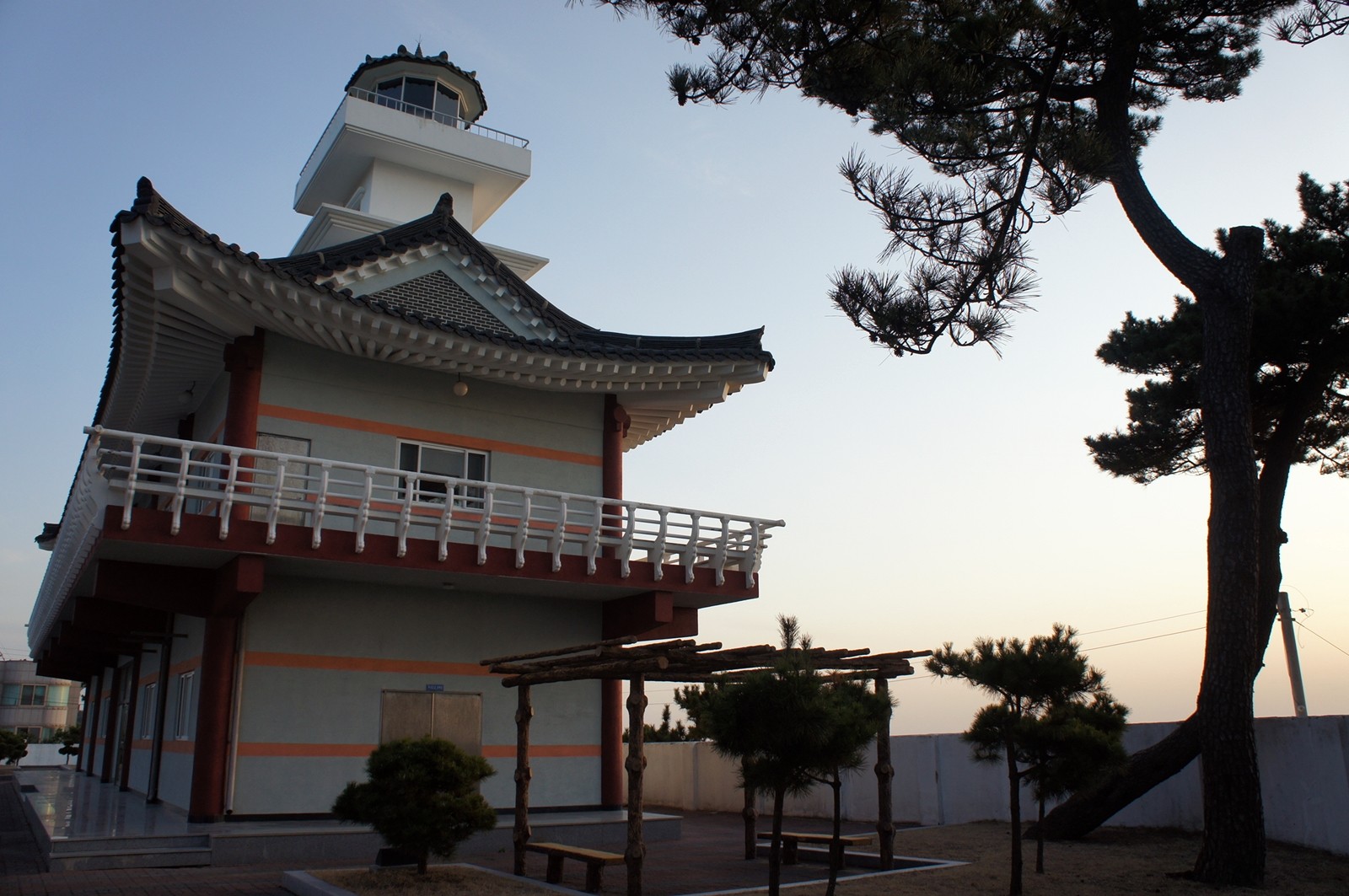 한옥 건물 위에 삼층석탑을 형상화한 등대가 올려져있다.